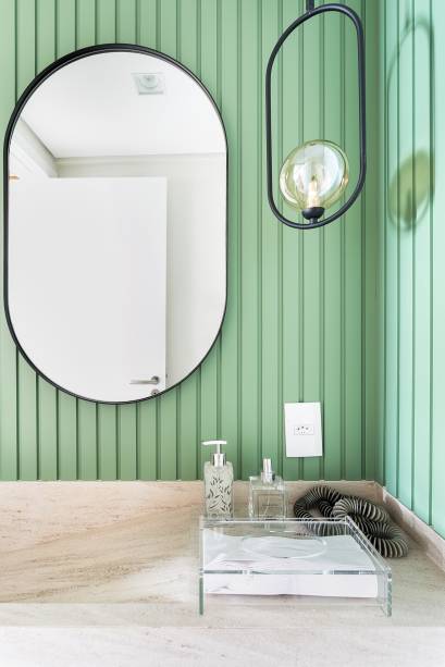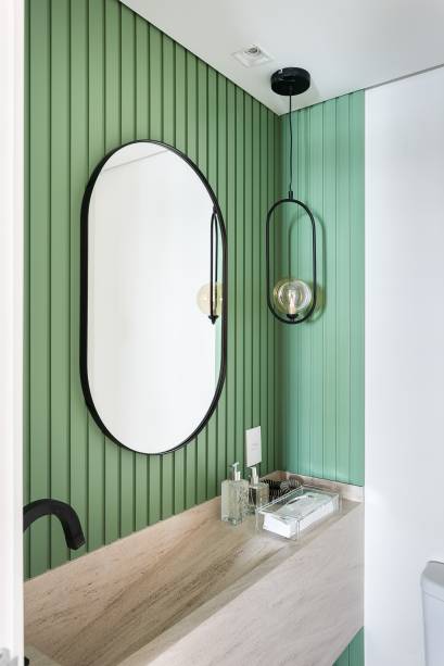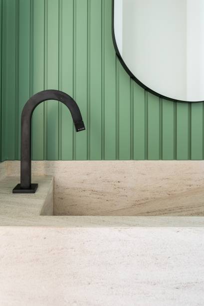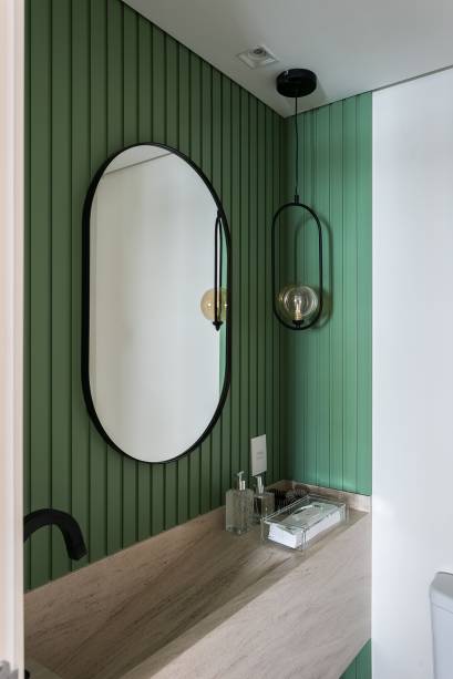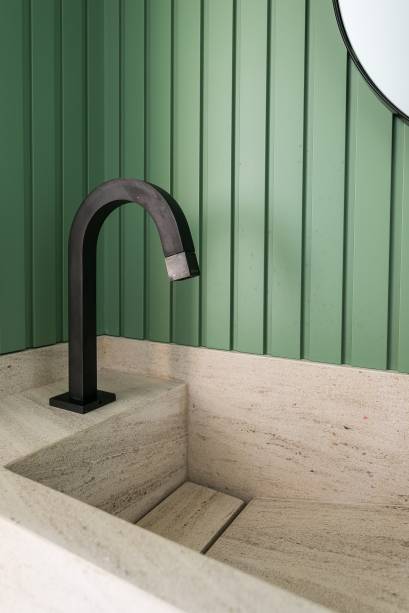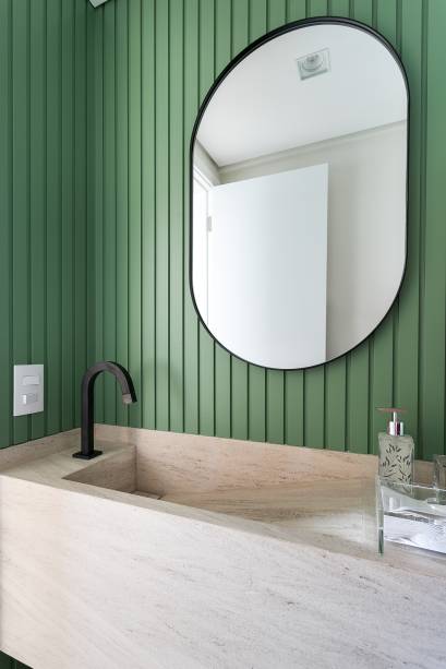O lavabo é um ponto focal do projeto. A arquiteta conta que ele foi concebido de forma mais “teatral”, com um painel verde e um espelho com arandela em serralheria preta. Para finalizar, foi acrescentado uma bancada esculpida com cuba inclinada.