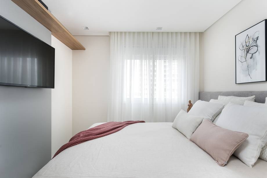 O quarto de hóspedes recebeu bastante atenção. Ele possui um grande armário, sofá que funciona como ponto de leitura e também como sofá cama e prateleiras para expor livros. A suíte master é um local de descanso e relaxamento, portanto, recebeu um décor claro, cabeceira estofada e mesinhas laterais delicadas.