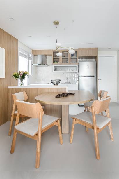 A profissional conta que o ponto de partida foi a integração entre a sala e a cozinha, de forma a garantir um bom espaço de armazenamento e também uma mesa para refeições. Como essa peça atrapalharia a circulação, a solução foi desenhar uma mesa especialmente para o apartamento com um formato orgânico, que se encaixa perfeitamente no ambiente.