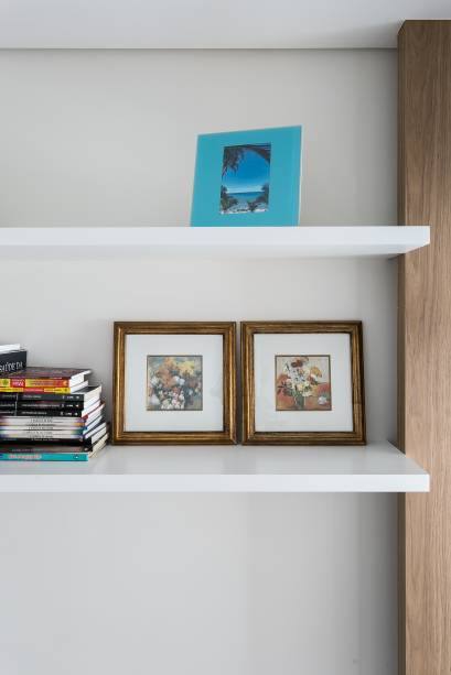 Integrando a cozinha com o living está uma estante de nichos que abriga objetos pessoais. Na sala de estar também merece destaque o rack azul que abriga a TV.