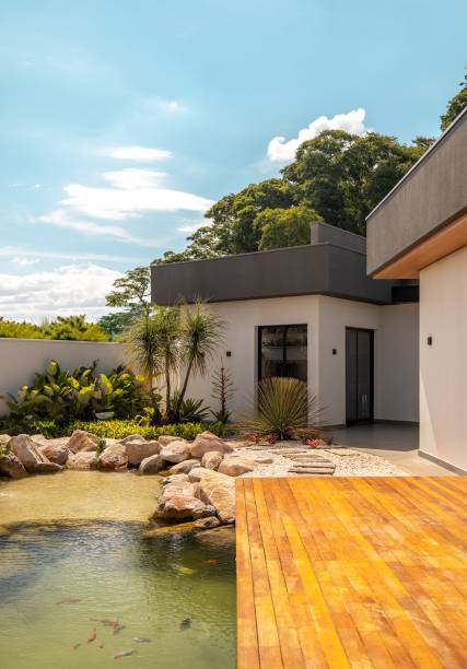 Ao lado, uma lareira rebaixada proporciona um ponto de apoio aconchegante para o relaxamento. Além disso, o espaço também abriga um lago e uma charmosa casinha na árvore, que oferece às crianças um espaço lúdico e mágico para brincar.