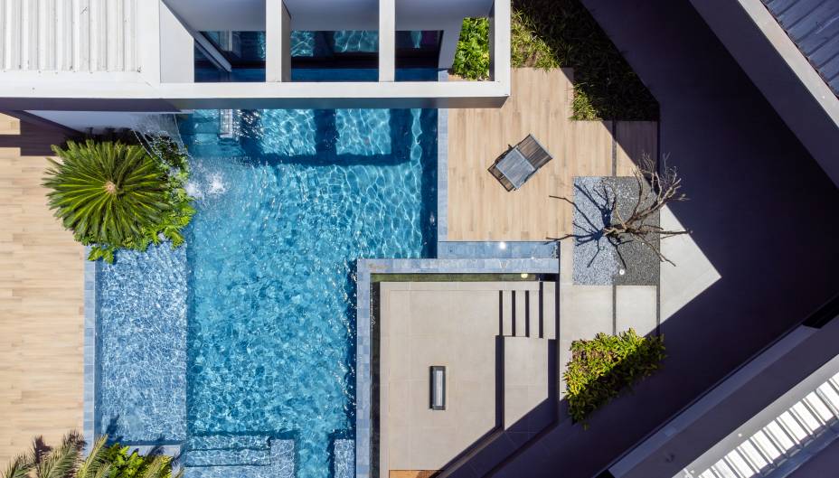 A piscina, um dos principais destaques do projeto, conta com borda infinita e áreas de descanso como a hidro e a prainha.