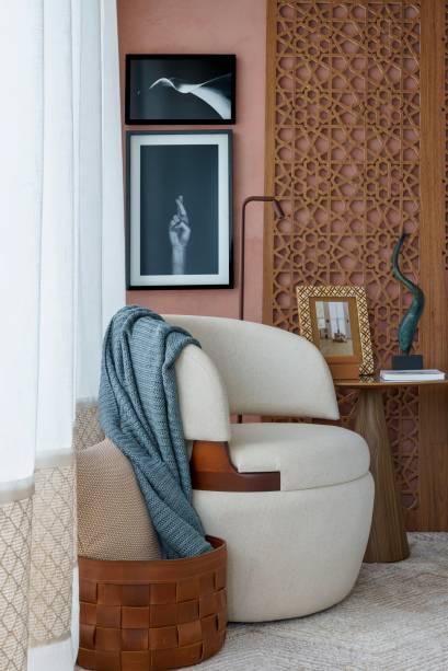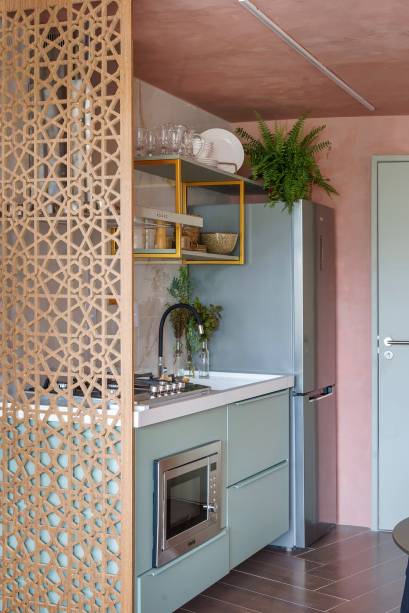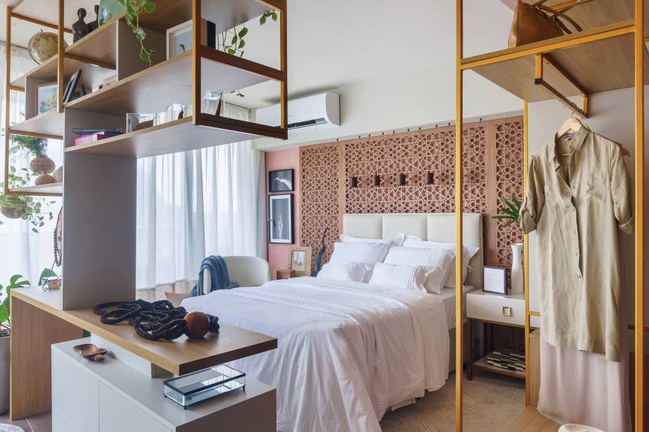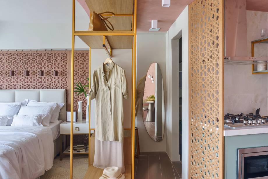 Para criar uma divisão visual, a arquiteta utilizou um muxarabi de MDF madeirado no limite da cozinha. O mesmo muxarabi, vazado e com um tom terroso suave, foi ampliado e usado como cabeceira para a cama, que tem a parede pintada com a mesma tonalidade. A área do quarto conta ainda com armário e estante, criando espaços para organização e armazenamento de roupas e outros itens.