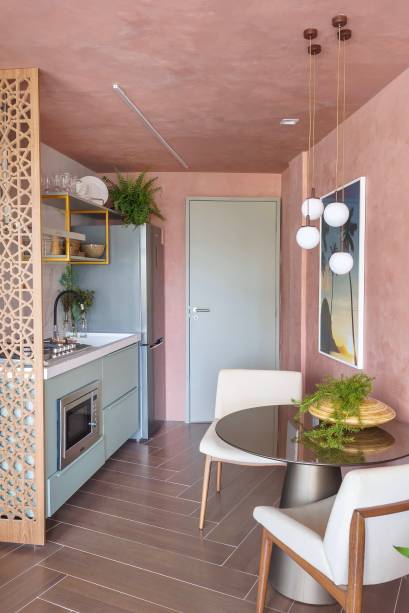Na cozinha, onde fica localizada a entrada do imóvel, um tom rosado em textura de mármore foi aplicado nas paredes e no teto, criando uma atmosfera acolhedora logo de início. O verde suave da marcenaria é visto novamente na parede da sala, em uma pintura feita pela artista plástica Giuliana Favero.