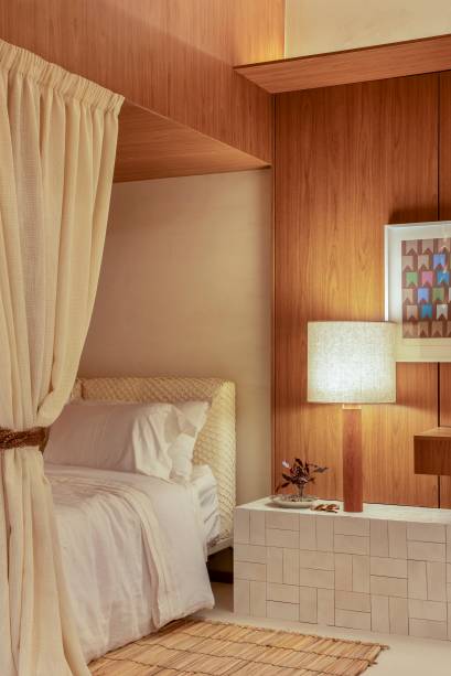 Para deixar o estúdio mais acolhedor e quebrar a monotonia dos “beges”, toda a marcenaria ganhou acabamento amadeirado no padrão freijó (da Arauco) – do bloco central ao painel de parede, passando pelos armários do quarto e da cozinha. Já a parede divisória que delimita a área do banheiro foi erguida em pau a pique, fazendo lembrar a origem rural do personagem Jeca Tatu.