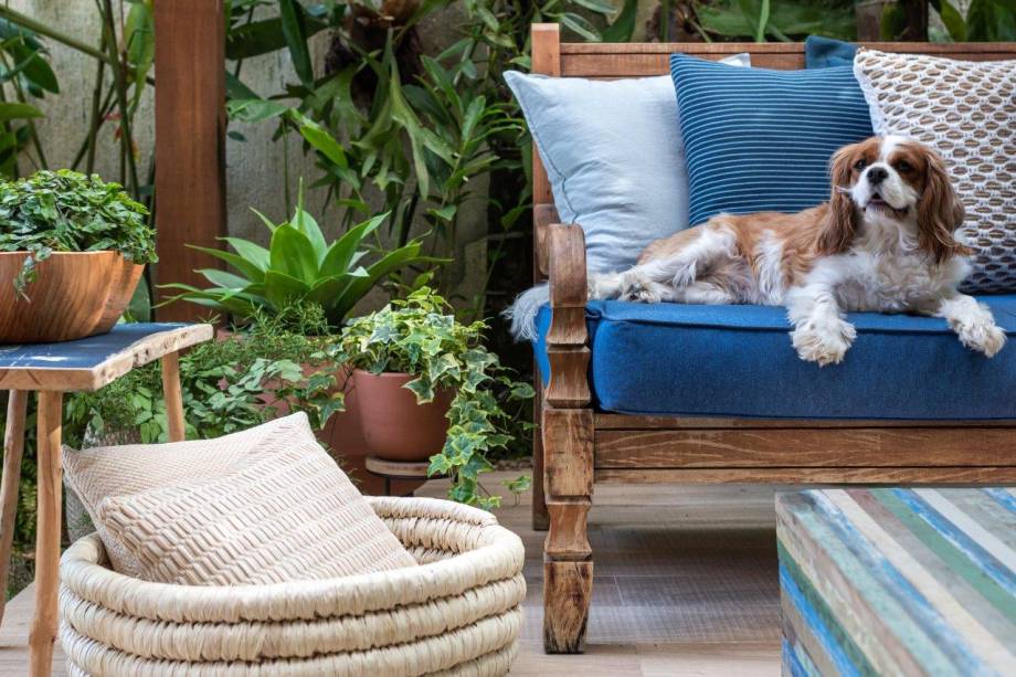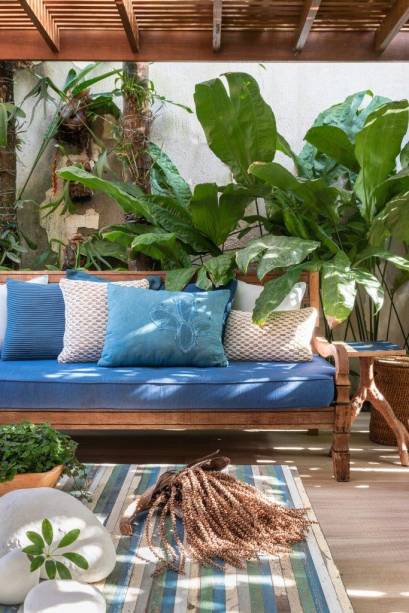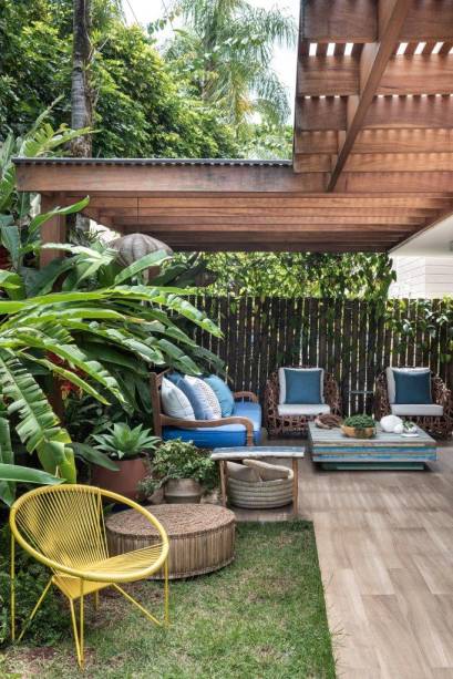 Ela e a varanda são englobadas por um pergolado de madeira maciça, que cria um ambiente perfeito para conversar e descansar.