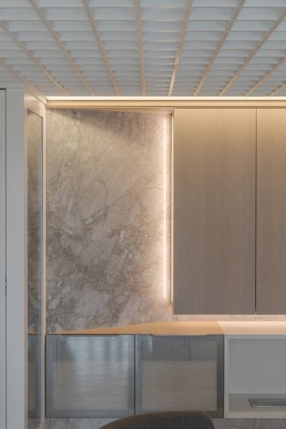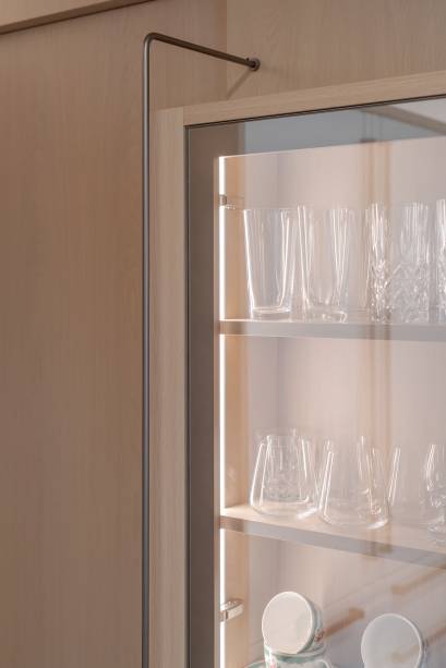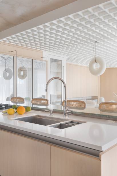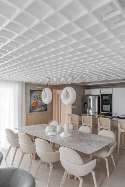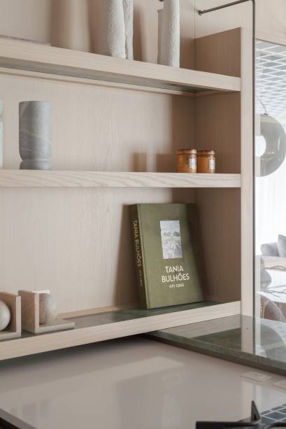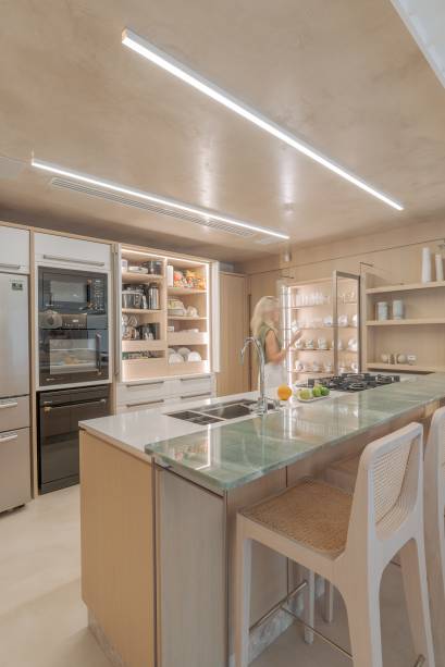 A região da cozinha, por sua vez, tem uma cristaleira que atende também o jantar. Detalhes exclusivos foram pensados para o morador, como os divisores de talheres de veludo, os porta guardanapos e guardanapos, além de soluções inteligentes de marcenaria.