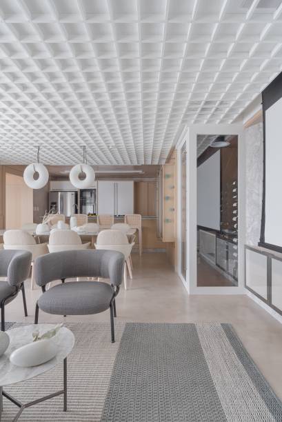 Para esta casa de 60 m², o escritório Studiocolnaghi buscou criar uma atmosfera neutra, com uso de poucos elementos e uma paleta única, proporcionando uma integração do espaço. A percepção de uma maior amplitude se deve à presença de um forro de madeira branco. Nele, há integradas soluções de áudio, vídeo, climatização e iluminação.