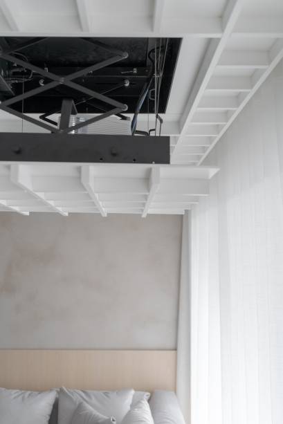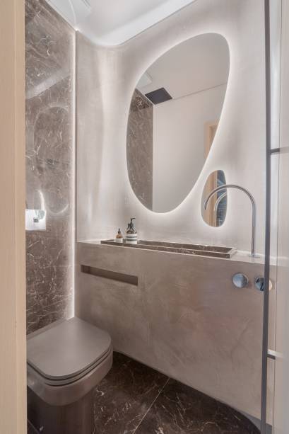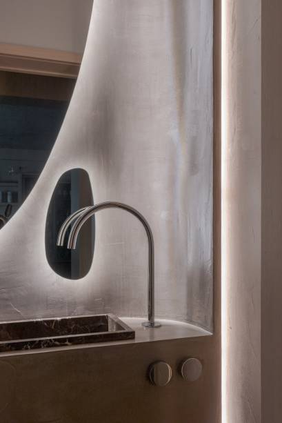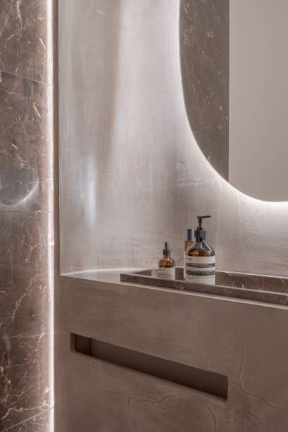 No lavabo, o projeto segue com a materialidade usada no piso, nas paredes e no restante do forro, o tecnocimento. A ideia novamente foi ampliar o espaço com uma solução monolítica e iluminação indireta.