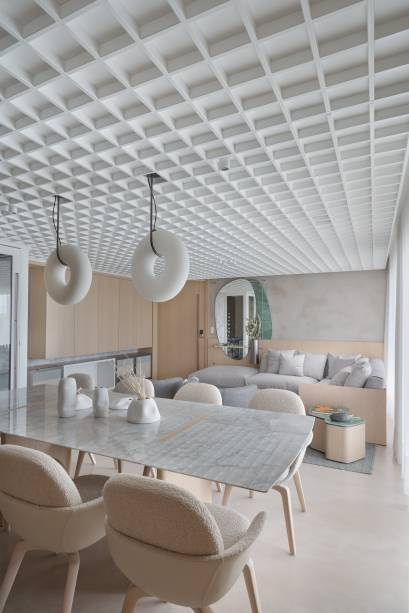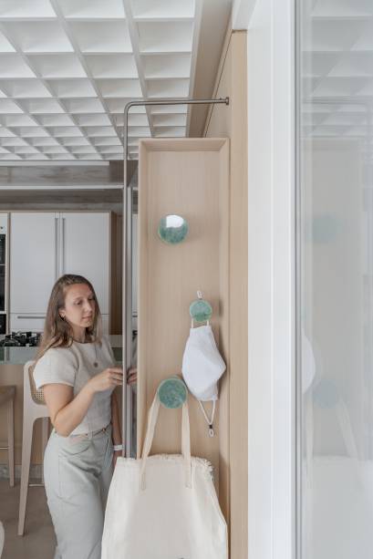 Já a escolha de uma lâmina de madeira clara combinada com o branco cria um plano de fundo atemporal para as peças de mobiliário solto, assinadas por Jader Almeida para Sollos.