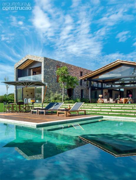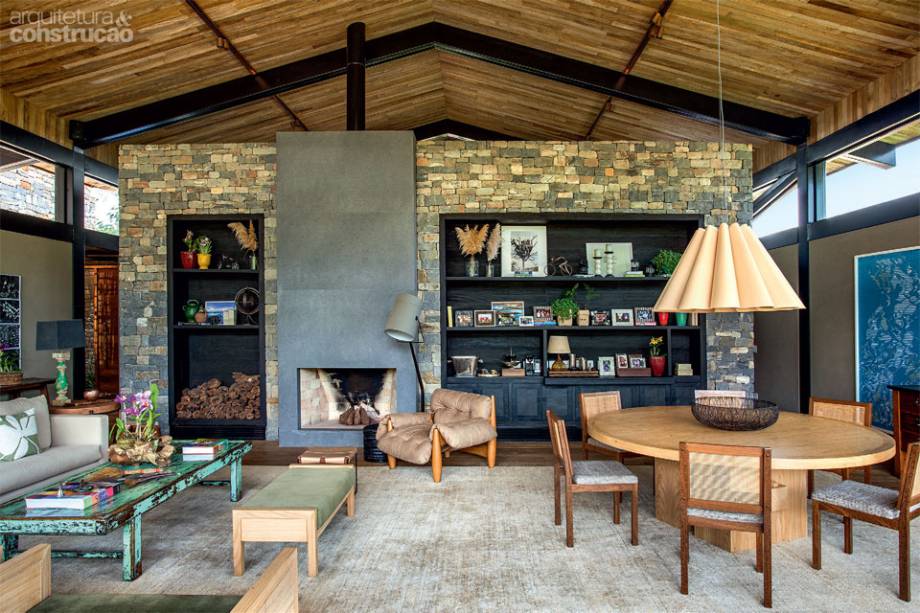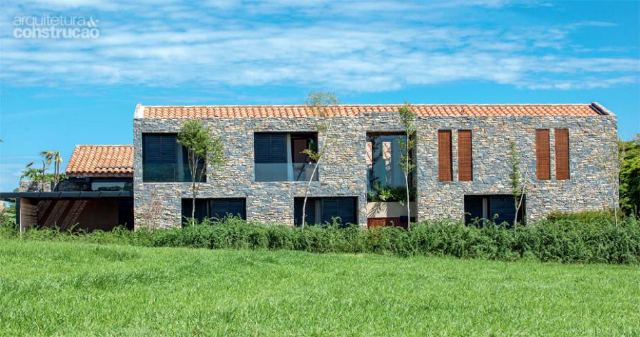 Bem postado entre os nomes que edificam a arquitetura contemporânea brasileira, marcada por volumes puros e concretos, o arquiteto paulista Gui Mattos ficou anos sem projetar uma casa com telhado aparente – até receber no escritório, em 2010, uma família interessada em erguer um lugar para passar os fins de semana longe da cidade grande. Estava dada a rara condição: o terreno de 2443 m², a cerca de 120 km de São Paulo, localiza-se num loteamento dentro de uma antiga fazenda convertida em empreendimento de lazer. Justamente para proteger essa atmosfera, o condomínio impõe diversas exigências aos interessados em se instalar por ali. Vetados as lajes planas e os terraços, tudo deve ostentar coberturas de duas águas e material orgânico. Se, no princípio, tal limitação fez a cabeça do arquiteto pender para uma linguagem obviamente brasileira, um fato novo inseriu coordenadas diferentes no seu GPS estilístico. “No meio do projeto, pensei em organizar a casa em dois blocos. Um seria dedicado à convivência, mais aberto e expansivo, e o outro, íntimo, reservado, ideal para descansar”, diz ele. Oportuna, a ideia convenceu os clientes, que levaram outra sugestão à mesa de reuniões: que tal incorporar alguma referência ao visual típico da Apúlia? A menção às moradias rurais centenárias dessa região da Itália, famosas pela cobertura cônica de pedras acinzentadas e esmaecidas, deu contornos definitivos à construção. O que se viu a seguir foi o amadurecimento de um conjunto que mesclava, de modo original, as restrições do condomínio e os desejos e pedidos do casal, sempre com a participação dos dois, que opinaram decisivamente sobre o que deveria constar do papel e ganhar materialidade. Um bom exemplo está na estrutura metálica. Eleita quando o proprietário encontrou um fornecedor de confiança, ela comparece em todo o refúgio e dá alguma leveza a seu visual. Também a pedra bruta, essencial para o toque contadino, entrou na pauta. Das cinco amostras testadas no canteiro, em cores e formas variadas, elegeu-se a mais retilínea. Com ela, Gui pôde forrar planos e quinas sem deixar arestas à mostra – um desenho geométrico e simples, no qual as telhas cerâmicas pouco aparecem. Estava vencido o desafio contemporâneo.