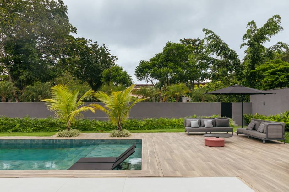 Já a divisão entre as áreas interna e externa é feita por uma porta pivotante em serralheria preta fosca também desenhada por Tom e que leva a um primeiro ambiente de estar, com uma sala e outra mesa com 12 lugares.