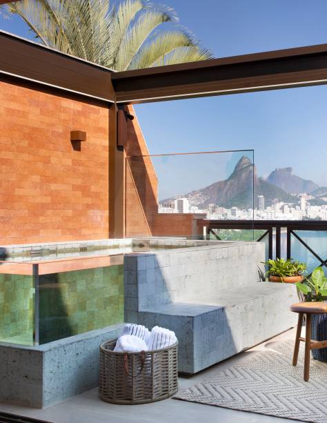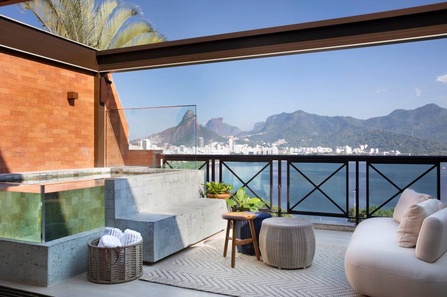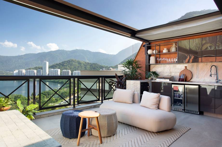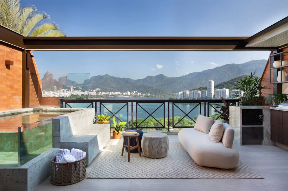 Um desta cobertura é, sem dúvidas, o terraço aberto do piso superior, de onde se avistam quatro cartões postais da capital carioca: Lagoa Rodrigo de Freitas, Pedra da Gávea, Morro Dois Irmãos e Cristo Redentor. Protegido por um toldo retrátil que pode ser 100% recolhido, este espaço conta piscina e espaço gourmet, equipado com churrasqueira e forno de pizza elétricos, cervejeira e frigobar.