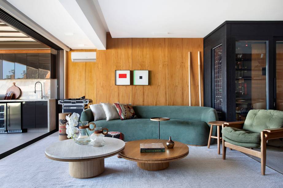Na sala de estar, vale destacar a poltrona Renata (do Sergio Rodrigues) e o par de poltronas Samba (do Maurício Bonfim), enquanto, na sala de jantar, os destaques são as cadeiras Ale (do Studio Doimo), a mesa de jantar Lineare (do Studio Sette7) e a luminária pendente LBBA (da Lina Bo Bardi). Na sala íntima com tv, roubam a cena o sofá Platô (do Jaime Bernardo), a poltrona Cuiabá (do Sergio Rodrigues) e a cadeira Liv Office (do Luan del Salvio). Na copa, as cadeiras Pedro são do designer Fernando Mendes.