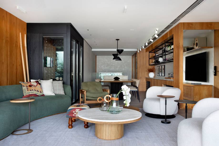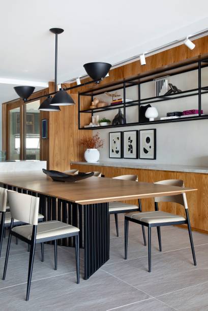 Na área social, o preto foi inserido para deixar o espaço sutilmente masculino – a cor está presente, por exemplo, na estrutura da adega climatizada piso-teto, na luminária pendente, na base da mesa de jantar e das poltronas, na estrutura das cadeiras e na serralheria que integra a estante de marcenaria.