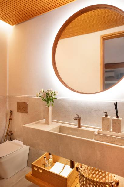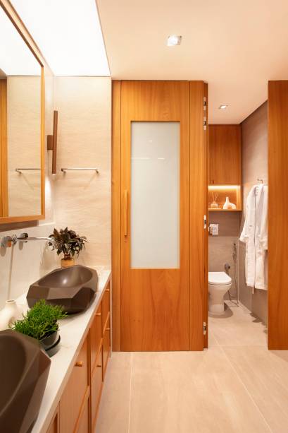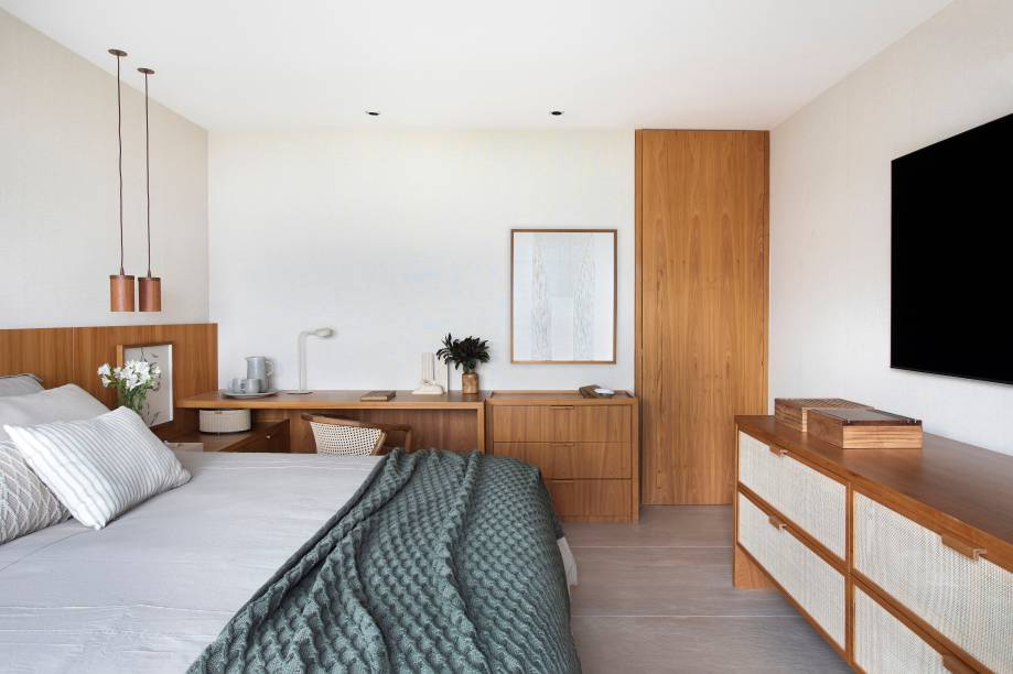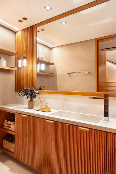 No quesito “cores, materiais e acabamentos”, para criar uma unidade visual na cobertura, as arquitetas revestiram todas as marcenarias com folha natural de peroba do campo e usaram o mesmo piso de porcelanato, em tom areia com superfície texturizada, nos dois andares.