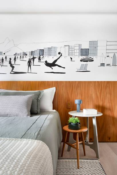 Como o cliente também adora cor, as arquitetas usaram tons de verde e azul no estofamento dos sofás e algumas poltronas, roupas de cama, armários da cozinha, tapetes, almofadas, quadros e adornos. “As paredes brancas dos quartos dos filhos ganharam ainda pinturas da artista Linda Valente, em tons de cinza – uma reproduz a Lagoa Rodrigo de Freitas, enquanto a outra, a orla de Ipanema”, informa a arquiteta Paula. No restante da decoração predominam os tons claros e neutros.