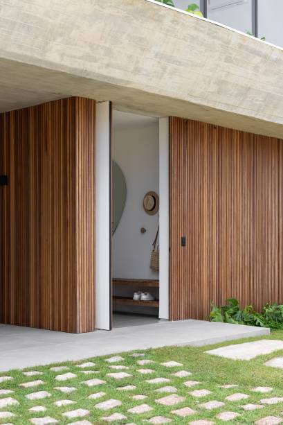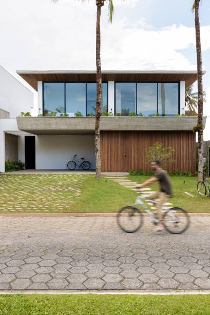 De acordo com os arquitetos, o forro de lambri na laje do segundo pavimento, as esquadrias pretas e o painel de madeira ripada que camufla a porta de entrada da casa também se destacam nas fachadas. “O segundo andar foi pensado em dois blocos ligados por uma passarela. Essa ligação criou um ambiente com pé-direito duplo que faz com que o forro de lambri externo entre pelo teto da sala”, detalha Gustavo.