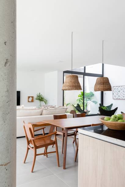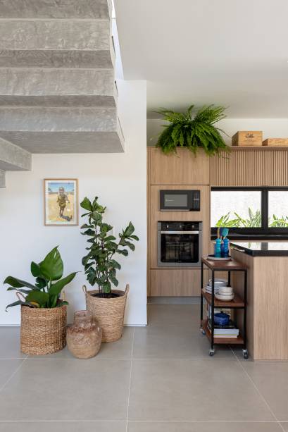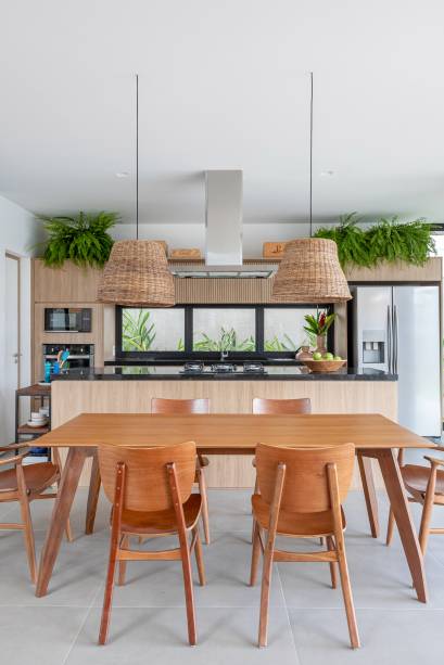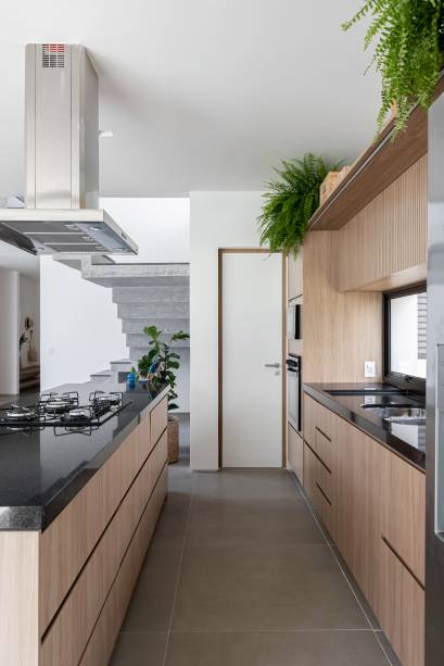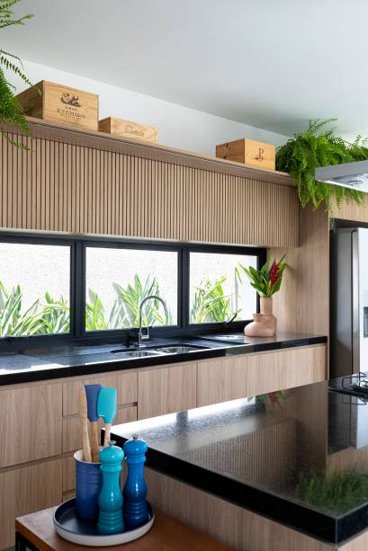A pedido dos clientes, a cozinha deveria ser o coração da casa e, portanto, posicionada de forma que todos pudessem interagir com quem está nela, de qualquer ponto do andar térreo. Por isso, o ambiente foi projetado totalmente integrado com a sala e ainda tem ligação direta com a área gourmet. Para garantir a entrada de luz natural, melhorar a ventilação e trazer o verde do jardim lateral da casa para dentro do espaço, os arquitetos acrescentaram uma janela entre a bancada e os armários superiores.