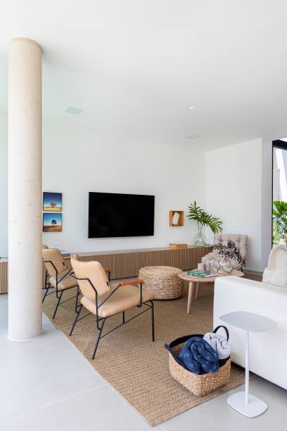 Também assinada pelo escritório, a decoração segue o estilo contemporâneo despojado com toques praianos, mas sem excessos, e partiu de uma base neutra pontuada por elementos naturais e tons terrosos. A única peça importante que já era acervo do cliente e foi aproveitada é o quadro com os azulejos do Athos Bulcão, que norteou, inclusive, a escolha das cores da área social da casa.