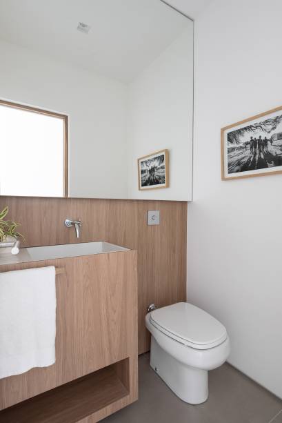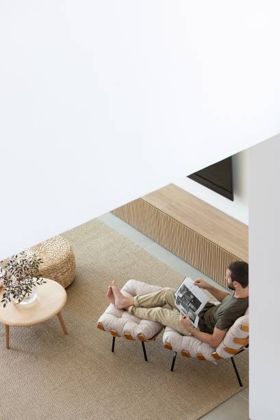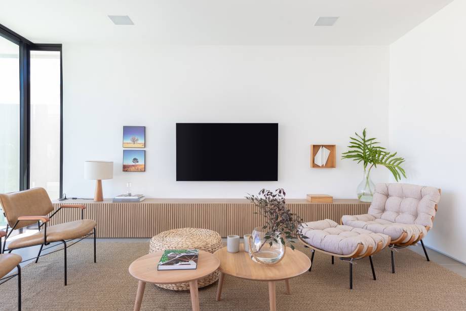 Como a casa foi pensada para os clientes receberem a família e os amigos, os arquitetos priorizaram móveis confortáveis e práticos, sendo a maioria de madeira para “aquecer” os espaços, já que todo o piso é de porcelanato cinza claro, em grande formato.
