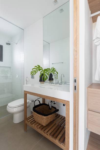 Outro pedido dos clientes: que todas as suítes fossem iguais, com mesmo estilo de decoração, além de práticas e com ar de pousada. Por isso, com exceção da suíte do casal, elas ganharam duas camas de solteiro que podem ser unidas para formar uma cama de casal, além de armários abertos tanto no dormitório quanto no banheiro e uma bancada de apoio que oferece a opção de trabalho remoto.