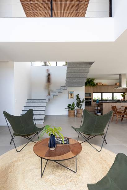 A busca por um “volume” arquitetônico leve e a combinação de materiais naturais – como madeira, fibra e couro – com concreto aparente e vegetação foi o ponto de partida para definir o conceito do projeto, bem como a máxima integração de todos os ambientes sociais da casa.