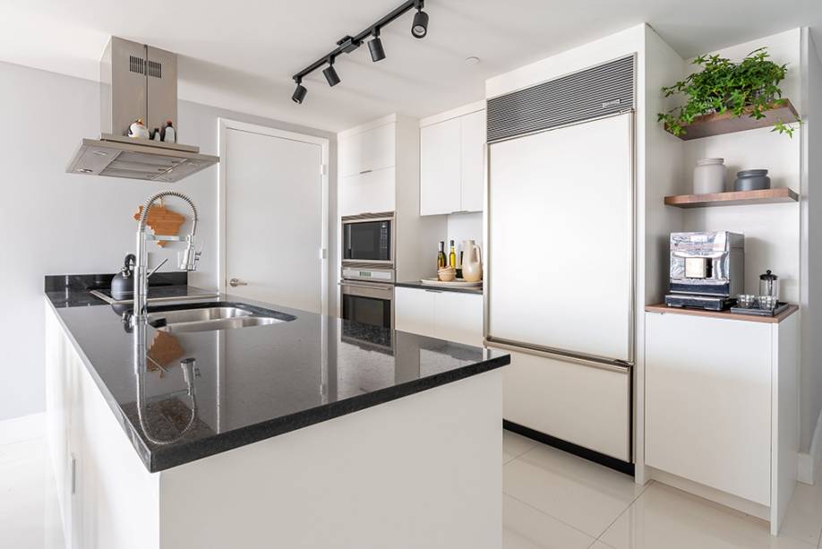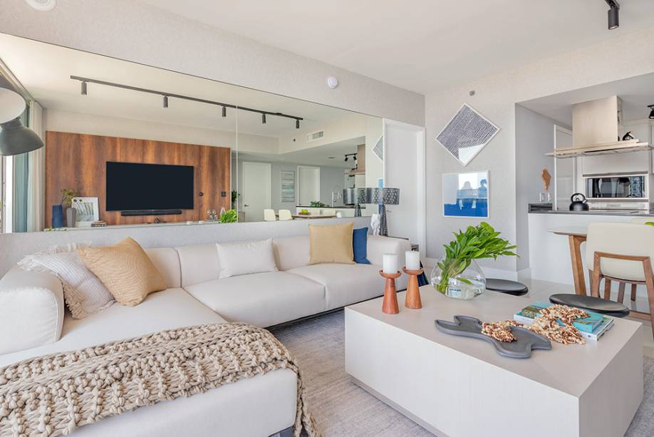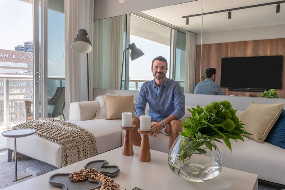 O projeto de interiores é da arquiteta Nayara Macedo, que pensou em uma paleta neutra, de tons claros, e uma cozinha integrada ao living, já que o hobbie favorito do morador é cozinhar, preparar drinques e receber os amigos em casa. Também por isso, ele também pediu uma sala versátil que pudesse acomodar mais pessoas em dias de casa cheia.