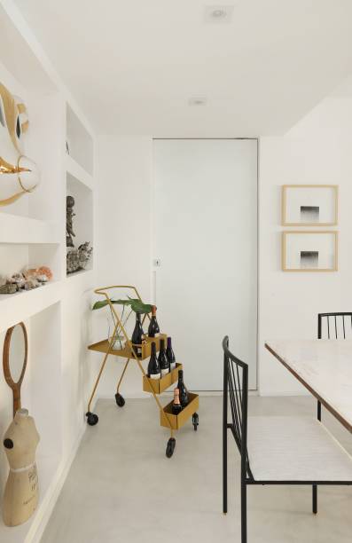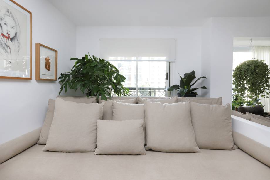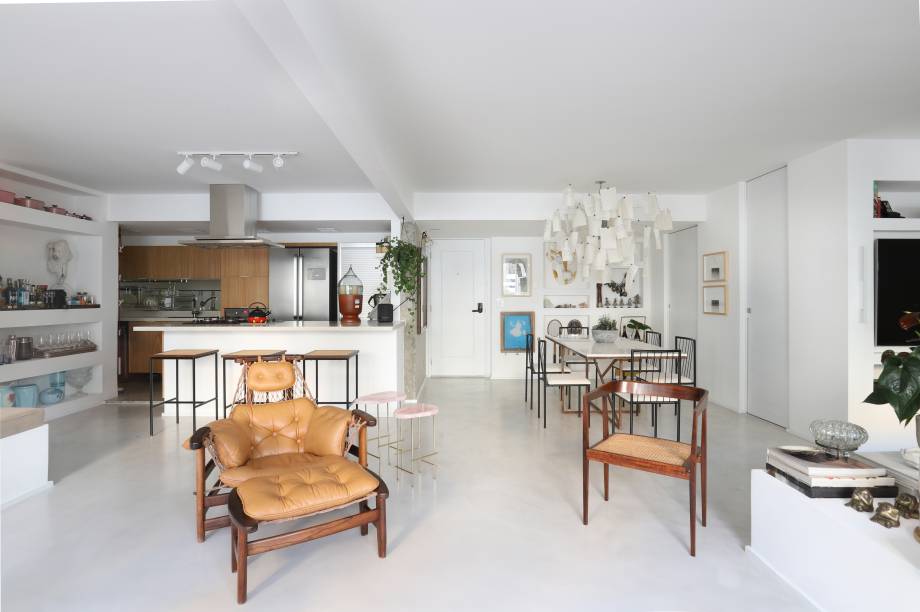 Para isso, o arquiteto optou por utilizar diversos móveis feitos de alvenaria, que criaram uma base neutra para as peças de design que a moradora já possuía.