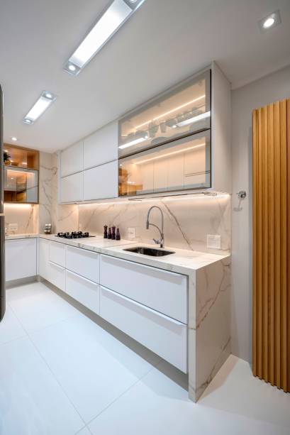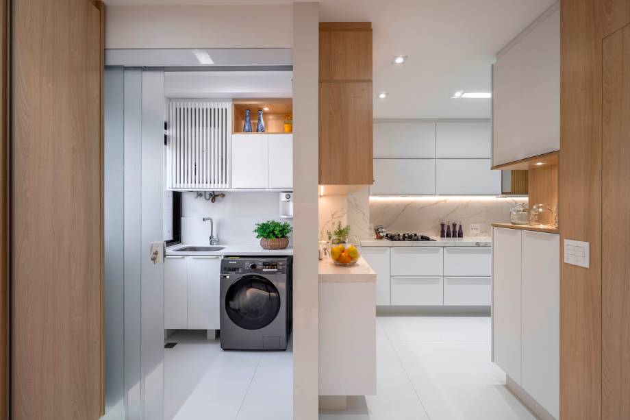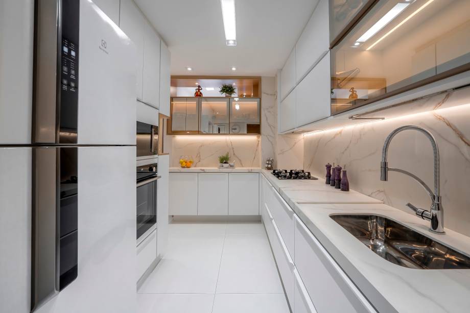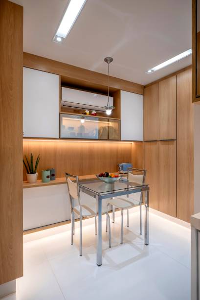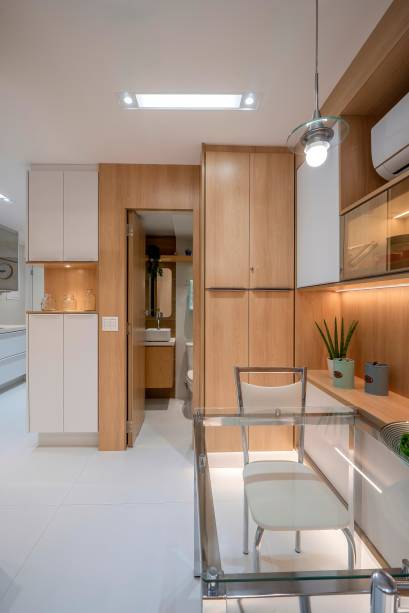 Os revestimentos – porcelanatos, tijolinhos em cimento rústico – em conjunto com a iluminação, com focos e perfis em LED, destacam os espaços e agregam modernidade e sofisticação na medida certa.