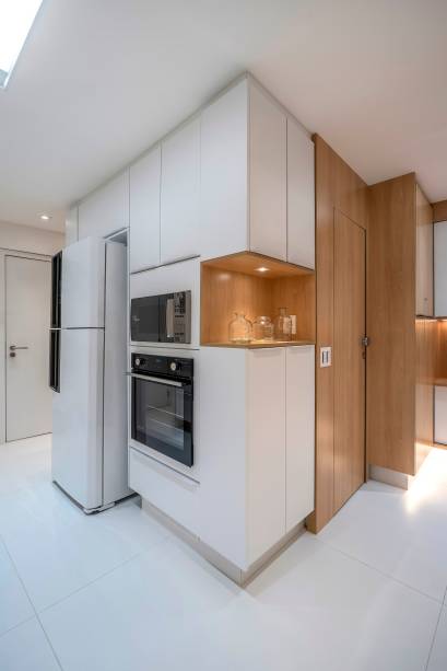 As marcenarias, além de bonitas e contemporâneas, deveriam permitir armazenamentos com elegância e leveza, sendo o ponto focal do projeto. A uniformidade de tons e texturas norteou todo o processo de concepção do projeto, garantindo harmonia e bem estar do apartamento de 150 m².