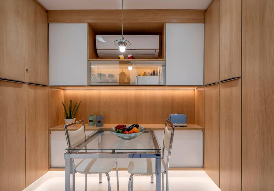 Móveis e objetos decorativos são realçados pelo projeto luminotécnico neste apê