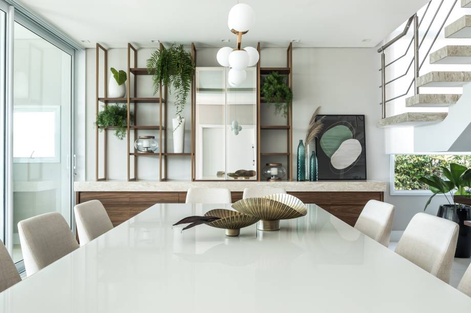 A sala de jantar conecta os ambientes sociais, integrando o living à churrasqueira gourmet e à cozinha, por meio de portas de correr, que permitem a integração ou não dos espaços. Um dos destaques do ambiente é o móvel de apoio, que serve como buffet e cristaleira, abraçado pela estante metálica e complementado pelos acabamentos em madeira e mármore, conferindo sofisticação ao espaço.