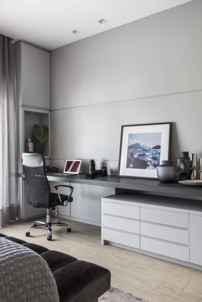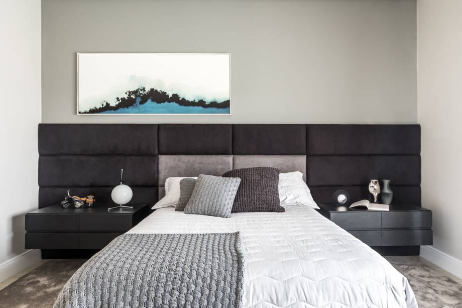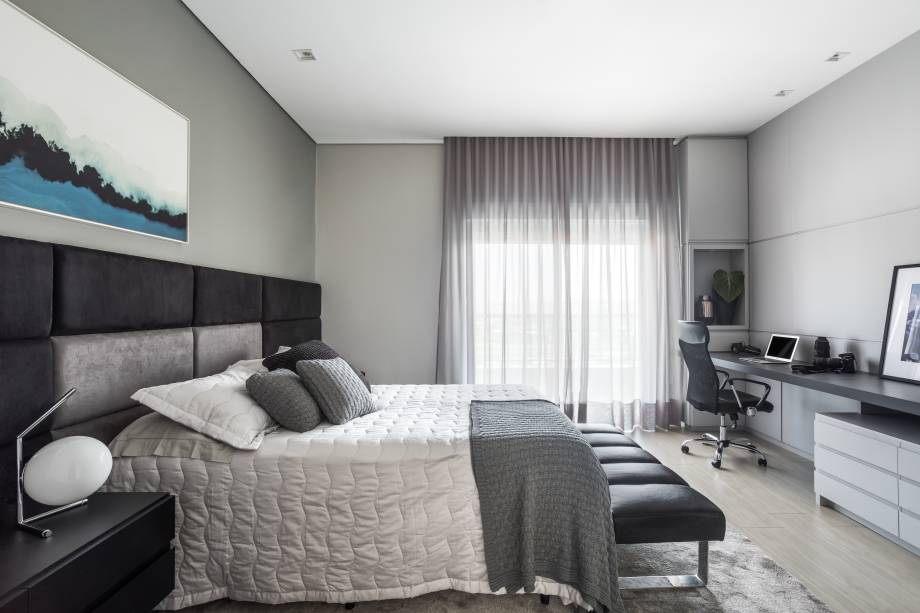 A área íntima foi pensada para atender às necessidades da família em sua fase atual. Nos quartos, a paleta de cores varia entre os tons de cinza ao preto, criando um contraste com as paredes claras. Elementos decorativos em azul e rosé ganham destaque, trazendo charme e suavidade aos ambientes.