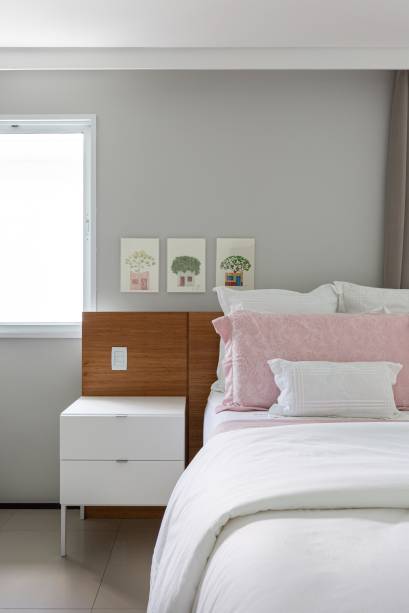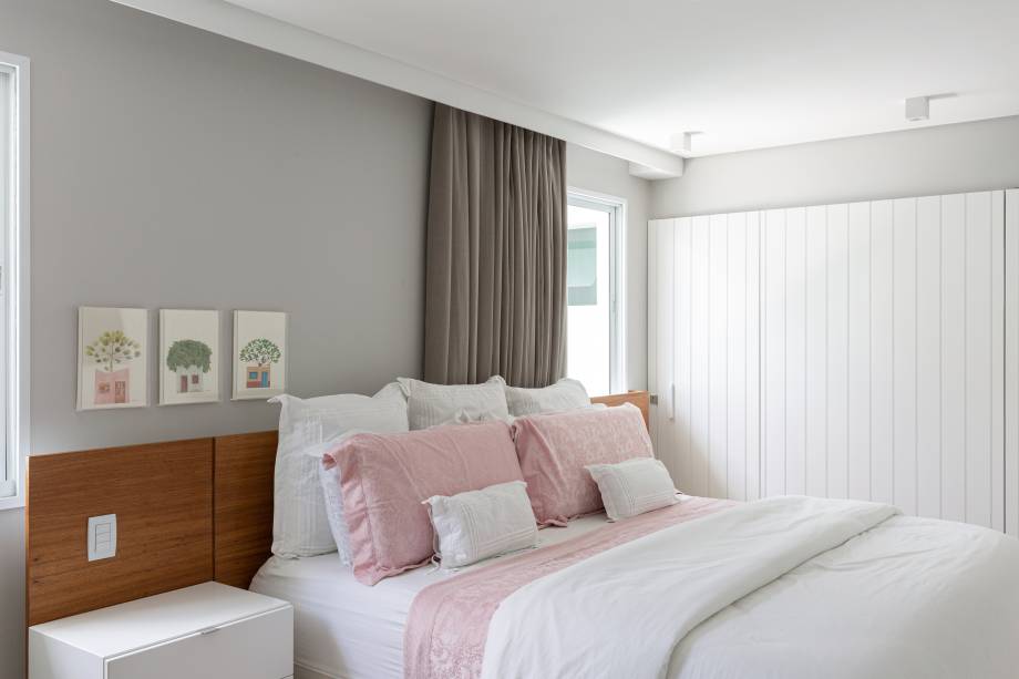 A cozinha foi dividida em dois ambientes. Em um espaço fechado, à direita da entrada da casa, fica um apoio operacional. Já, na área integrada, foi montado um espaço gourmet, integrado com a sala de jantar e o living. Nesse ambiente, os armários superiores receberam revestimento branco, o que trouxe leveza ao décor.