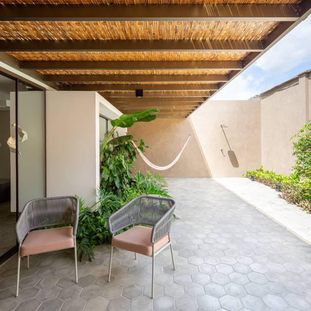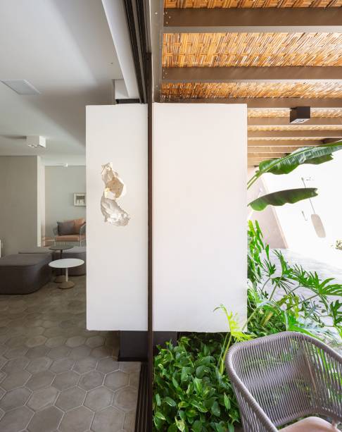 –Na estrutura da casa, destaca-se uma moldura branca, que cria um quadro de duas faces: do lado interno, abriga um confortável sofá e, do lado de fora, o generoso beiral recebeu plantas em vasos, que criam um volumoso jardim. A ideia do quintal, aliás, é uma interpretação tropical do conceito italiano cortile, que consiste em um pátio pavimentado, com poucos elementos, como uma rede, chuveirão e banco de madeira. O essencial para os momentos de relax a família.