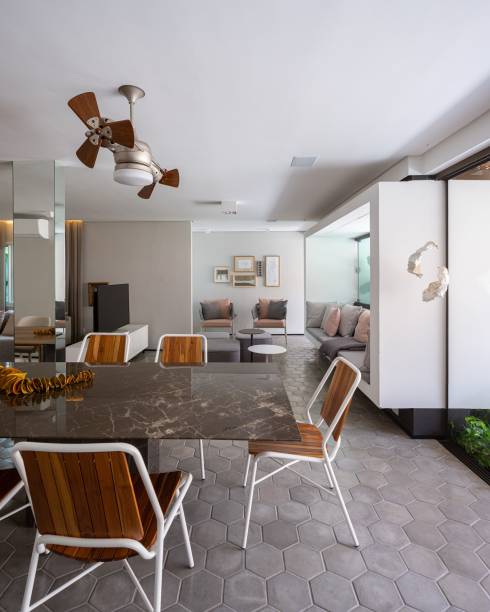 A interação entre dentro e fora fica ainda mais evidente por causa do piso. Os arquitetos escolheram o mesmo revestimento, um ladrilho cimentício, para os ambientes internos e o quintal. Esse acabamento, aliás, dialoga com um trecho de porcelanato, que já existia em uma parte da sala.