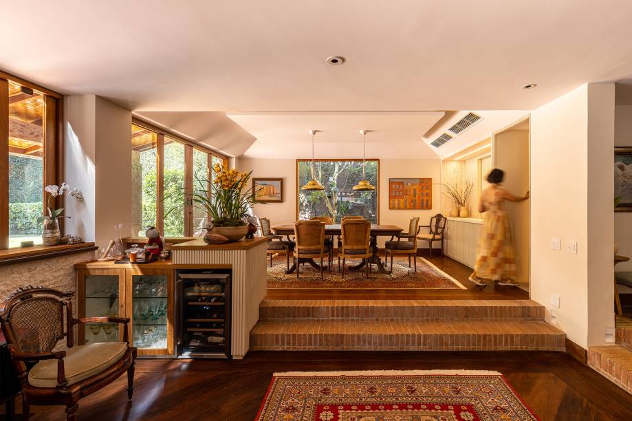 Aliás, uma das características da arquitetura original são os pisos que se organizam em dois níveis diferentes, com degraus interligando os ambientes. Na varanda, a parte mais alta virou o espaço de refeições ao ar livre, com uma charmosa mesa de jantar. E, como o piso de diversos pontos da construção é revestido de mosaicos de tijolos, os degraus ganharam tijolinhos aparentes.