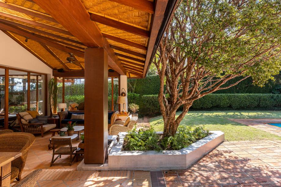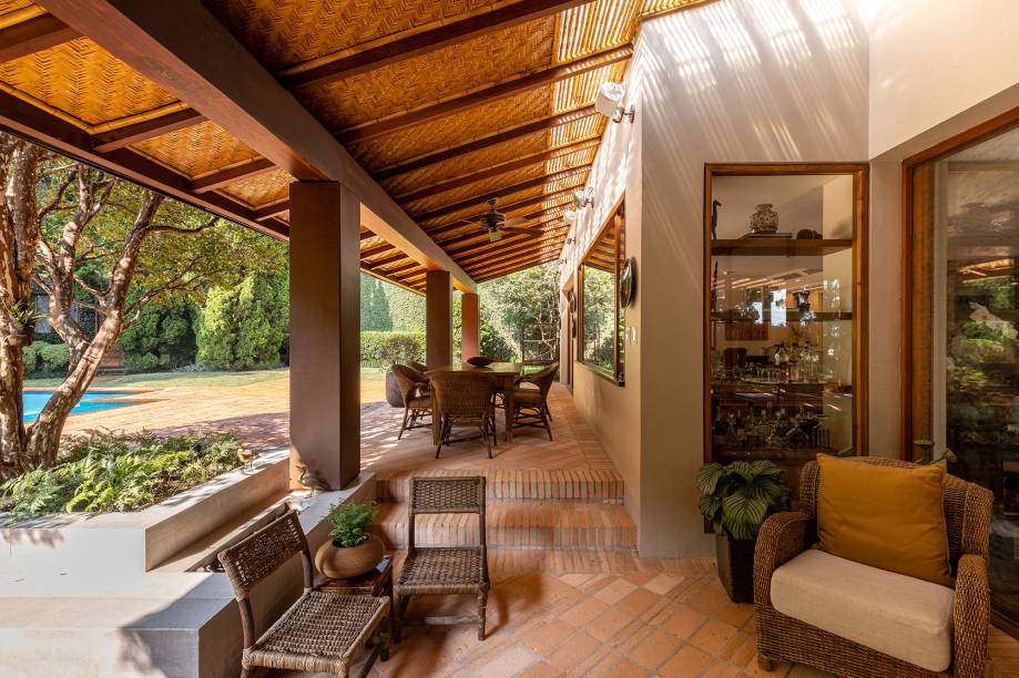 A ampla varanda sofreu diversas modificações: o projeto antigo deixava as salas frias e com pouca luz natural devido ao inclinamento do telhado. “Desmontamos a cobertura original que tinha 45% e realinhamos o vigamento em 30%. E o pé-direito no beiral que era de 1,80 m foi para 2 m”, conta o escritório. Algumas telhas de vidro com ripado de bambu auxiliam na iluminação e o resto da estrutura recebeu forro de palha tramada.
