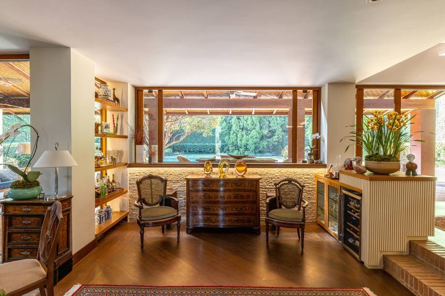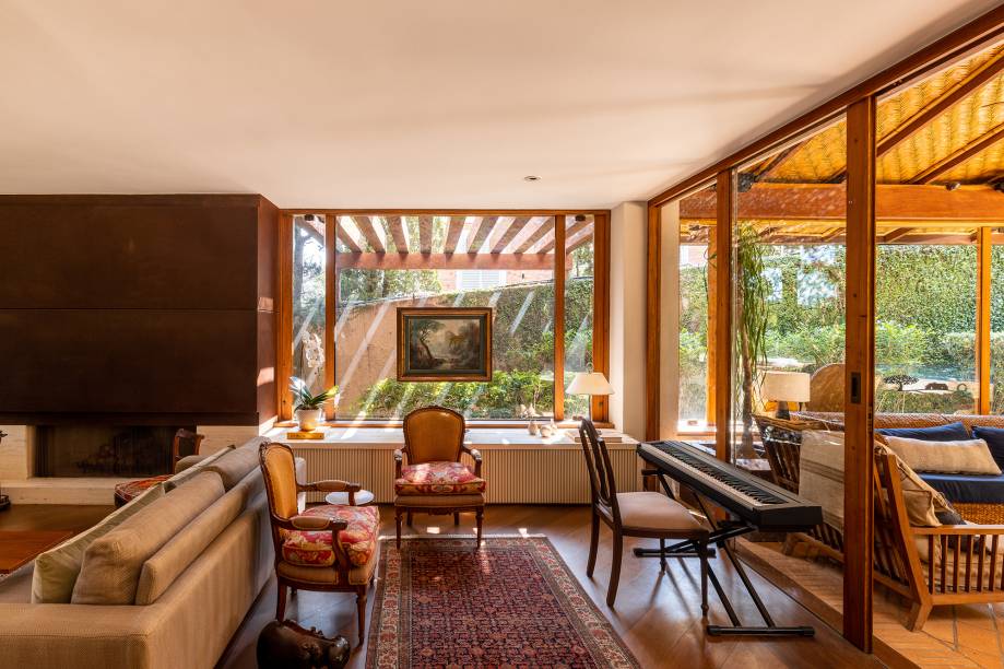 Em uma das laterais, um estar menor mais íntimo com poltronas e espaço para o teclado se aproveita da vista para o jardim – aqui, a área externa pode se integrar ao living somente abrindo a porta de vidro.