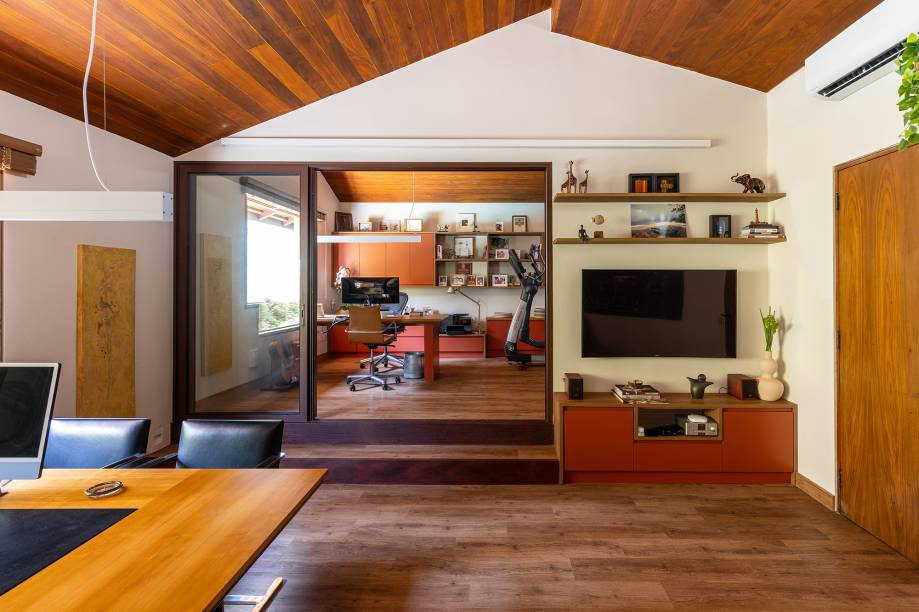 Os escritórios ficam em frente às escadas e ambos foram feitos com marcenaria amadeirada e toques de laranja terracota. Entre as duas salas, há uma área com equipamentos de ginástica e TV.