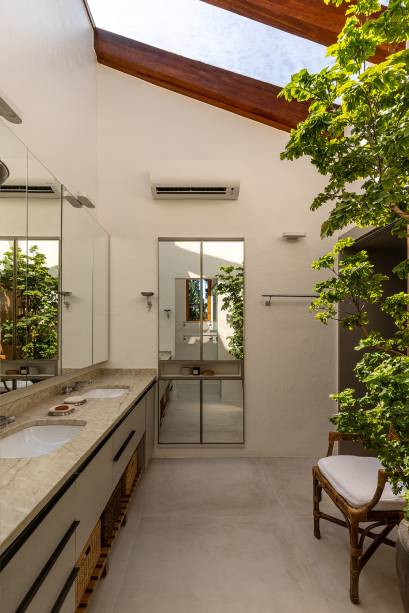 O banheiro da suíte tem iluminação zenital. “Essa proposta é original da casa e mantivemos, que é uma delícia! Trocamos os acabamentos para ficar dentro da paleta de cores e texturas do projeto”, diz Marina.