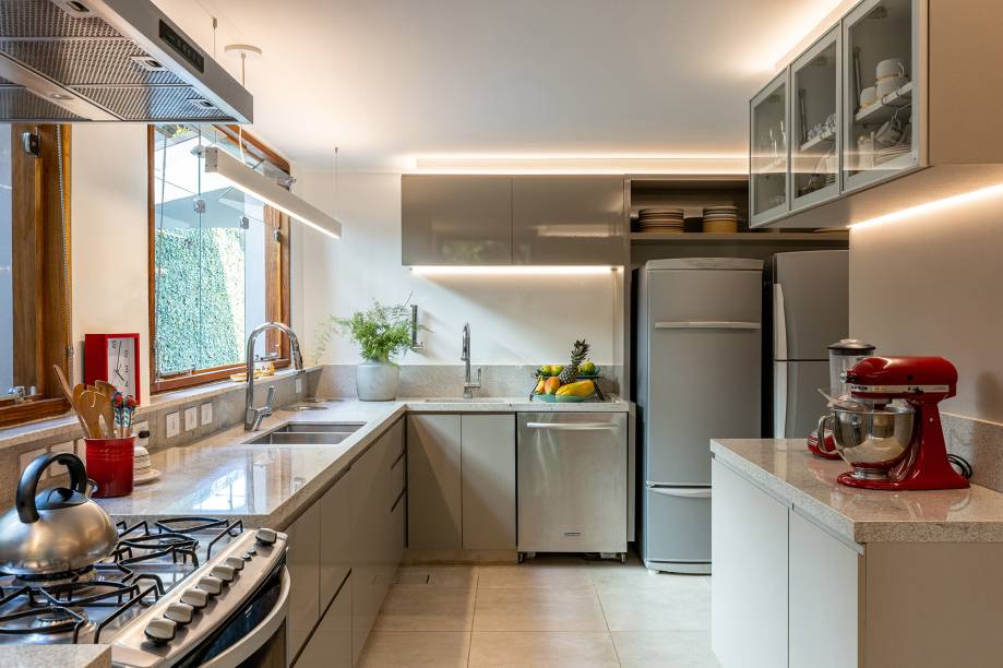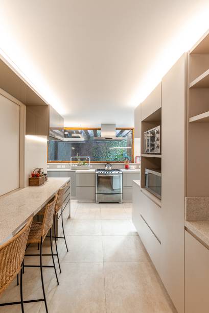 A ilha central com armários altos oculta um pilar. “Como o pé-direito da cozinha é baixo, com 2,3 m, e é laje, decidi fazer todos os rodatetos iluminados e embutir led na parte debaixo dos armários suspensos”, explica a arquiteta.
