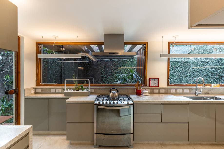 A cozinha foi ampliada incorporando a área da antiga sala de almoço. Como as janelas dos dois cômodos eram diferentes entre si, a opção foi seguir o modelo pré-existente da casa que tinha folhas fixas e basculantes sem guarnições. Abaixo das esquadrias, um frontão contínuo funciona quase que como uma uma prateleira, dando mais áreas de apoio. Todos os tampos são de granito itaúnas e a marcenaria tem tons de cinza e bege.