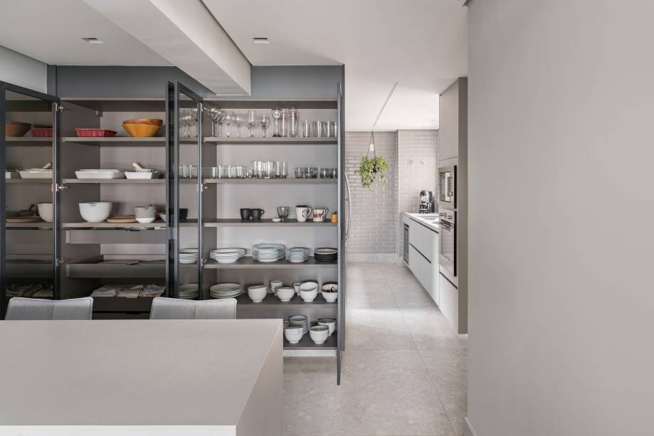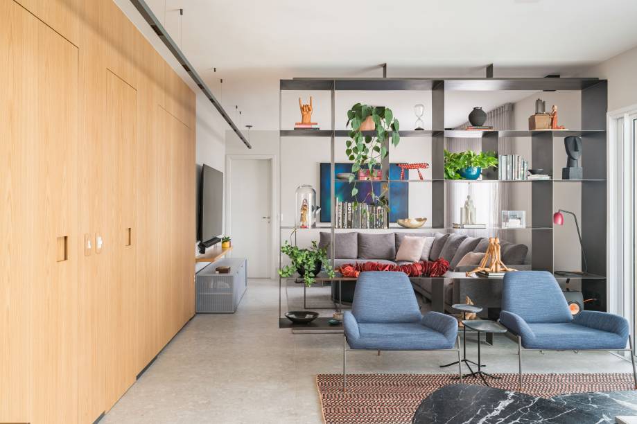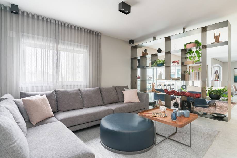 Das viagens que fizeram ao longo da vida, o casal trouxe peças afetivas que somaram à decoração. Estes objetos de coleção foram expostos no décor em uma estante criada especialmente para esse fim. O móvel foi projetado a quatro mãos, com ideias dos arquitetos e do casal. Feita com serralheria, ela é vazada e traz fluidez para o layout.