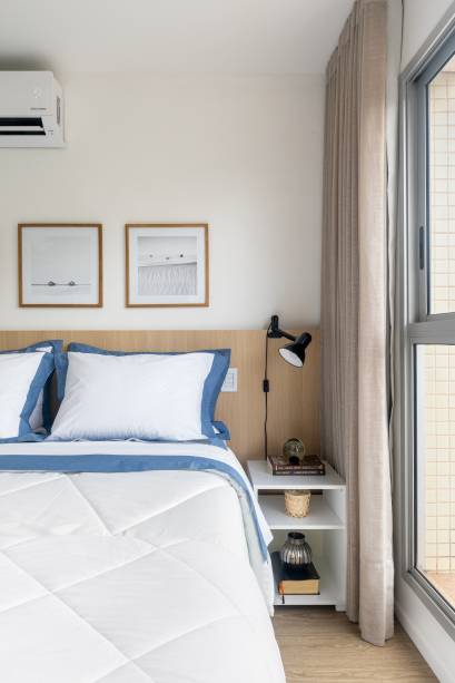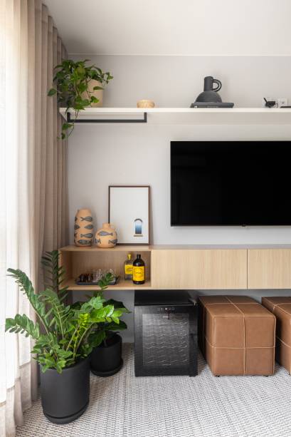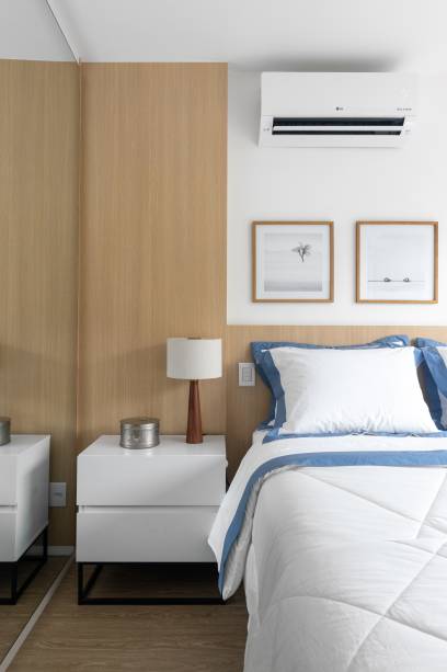 A área de descanso recebeu estante para TV com portas e gavetas e uma cabeceira iluminada em painel amadeirado.