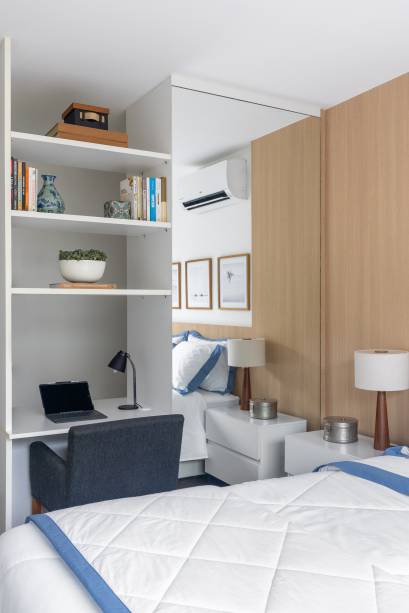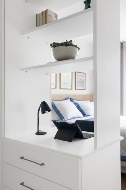 No andar superior, o closet foi reformulado com a criação de uma bancada de estudos.
