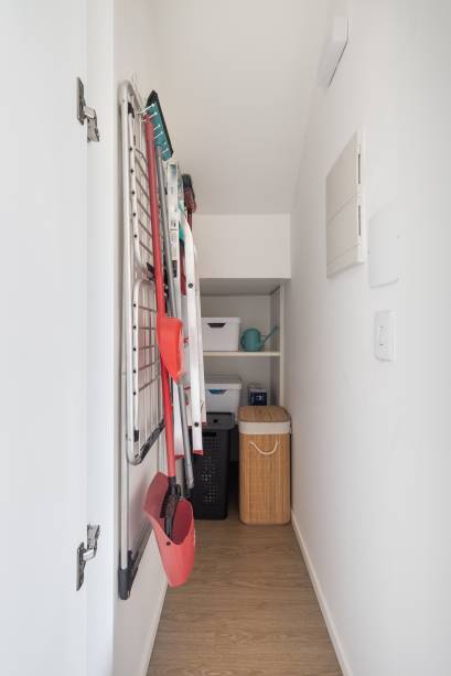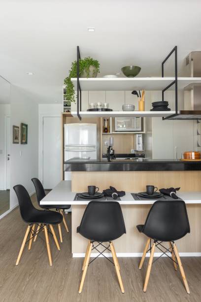 Como o apartamento era pequeno, as paredes foram pintadas de branco para deixar a luz natural ser refletida nos ambientes. A marcenaria inteligente se fez necessária em todos os espaços.