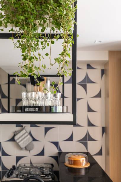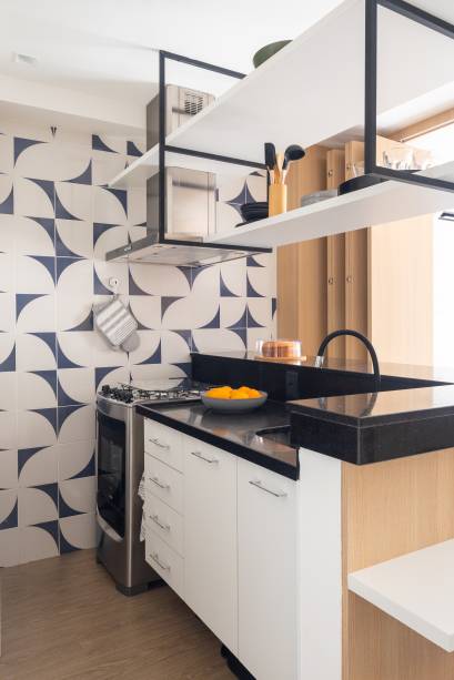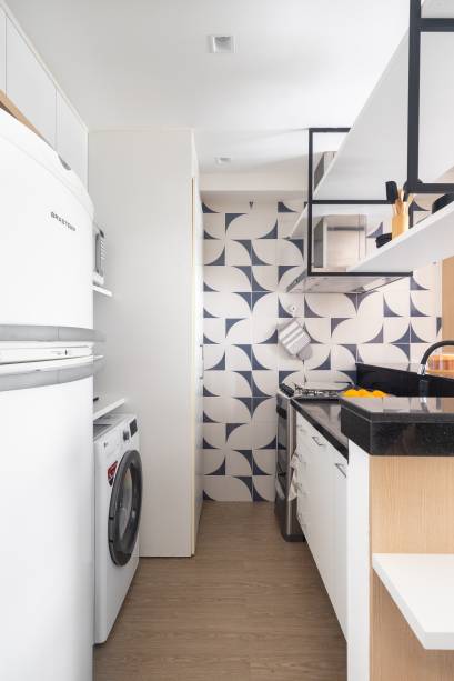 No piso inferior, a uma das paredes da cozinha foi revestida com azulejos para delimitar os ambientes, formando um grande painel que reflete no espelho. A bancada de granito foi mantida e recebeu marcenaria para refeições, estudo ou trabalho.