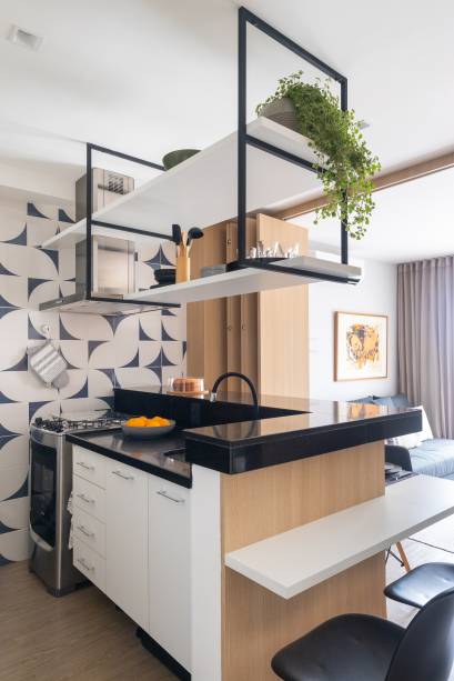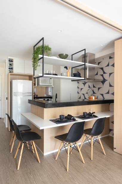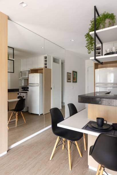 O escritório Morada3112 utilizou painéis articulados de madeira no dúplex compacto de 59 m² para separar a cozinha da sala, que conta com um sofá cama.